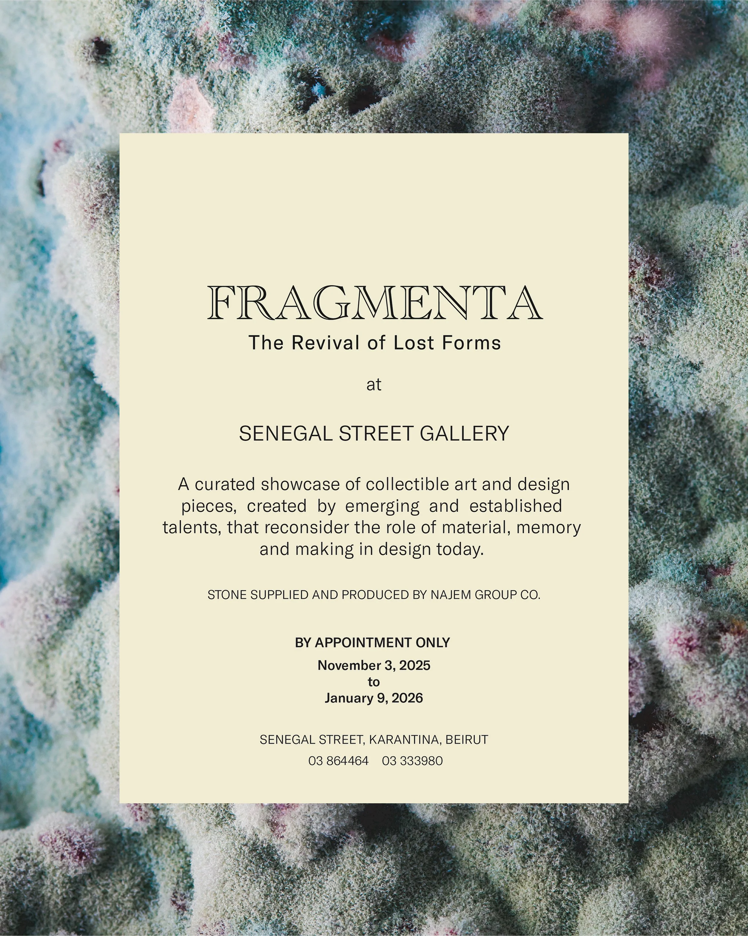 FRAGMENTA launched in September 2025 at the Najem Group factory in Beirut, in November 2025, it moved to Senegal Street Gallery, positioning stone not just as a building material, but as a vessel for memory, resilience, and renewal.