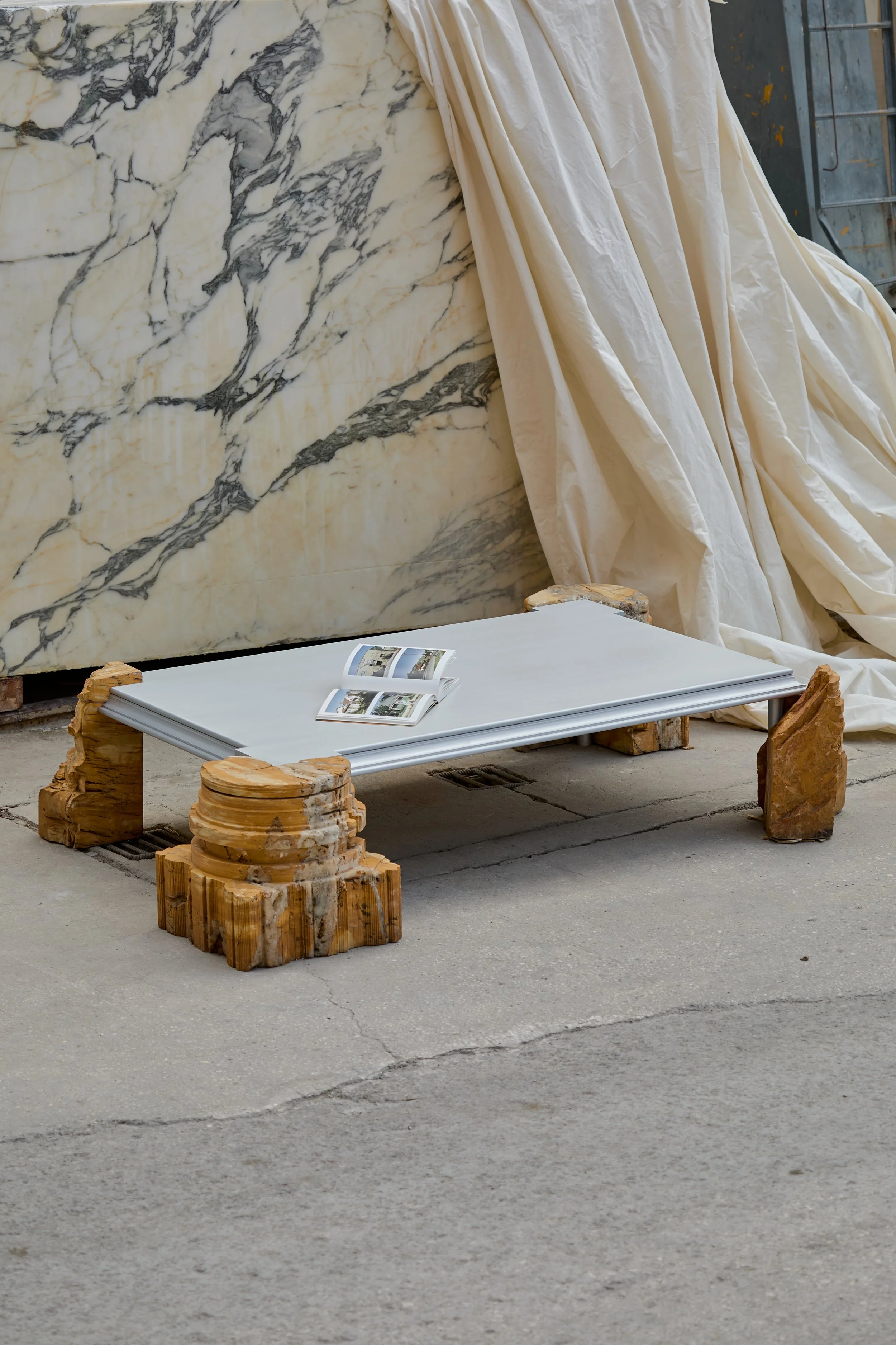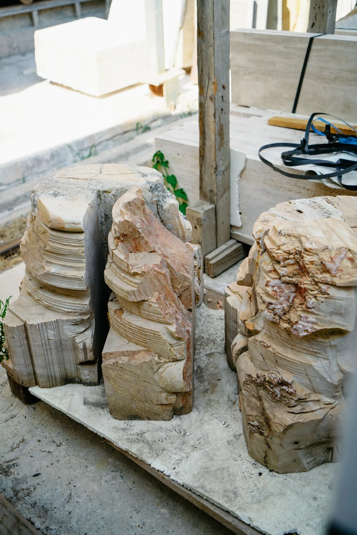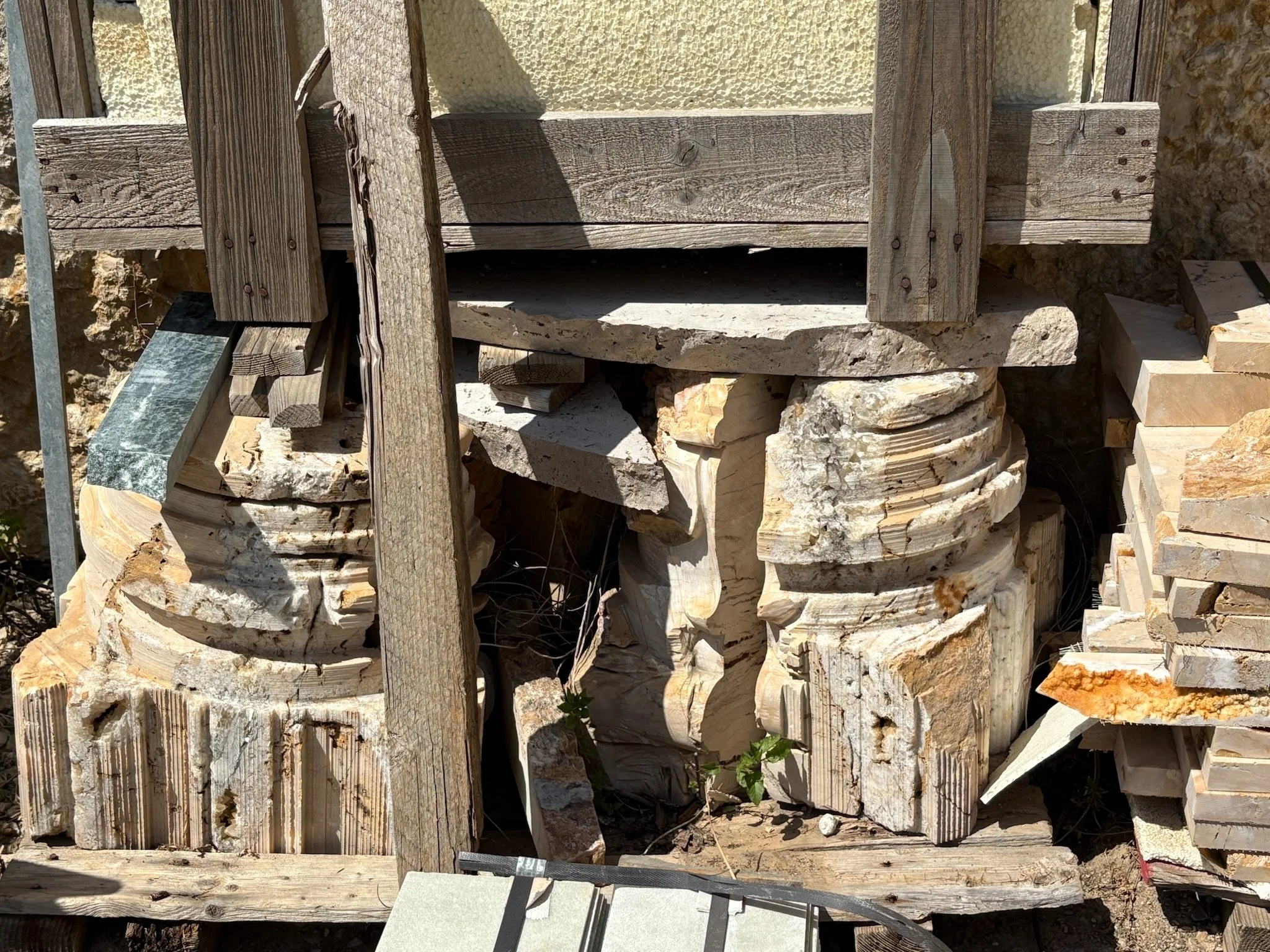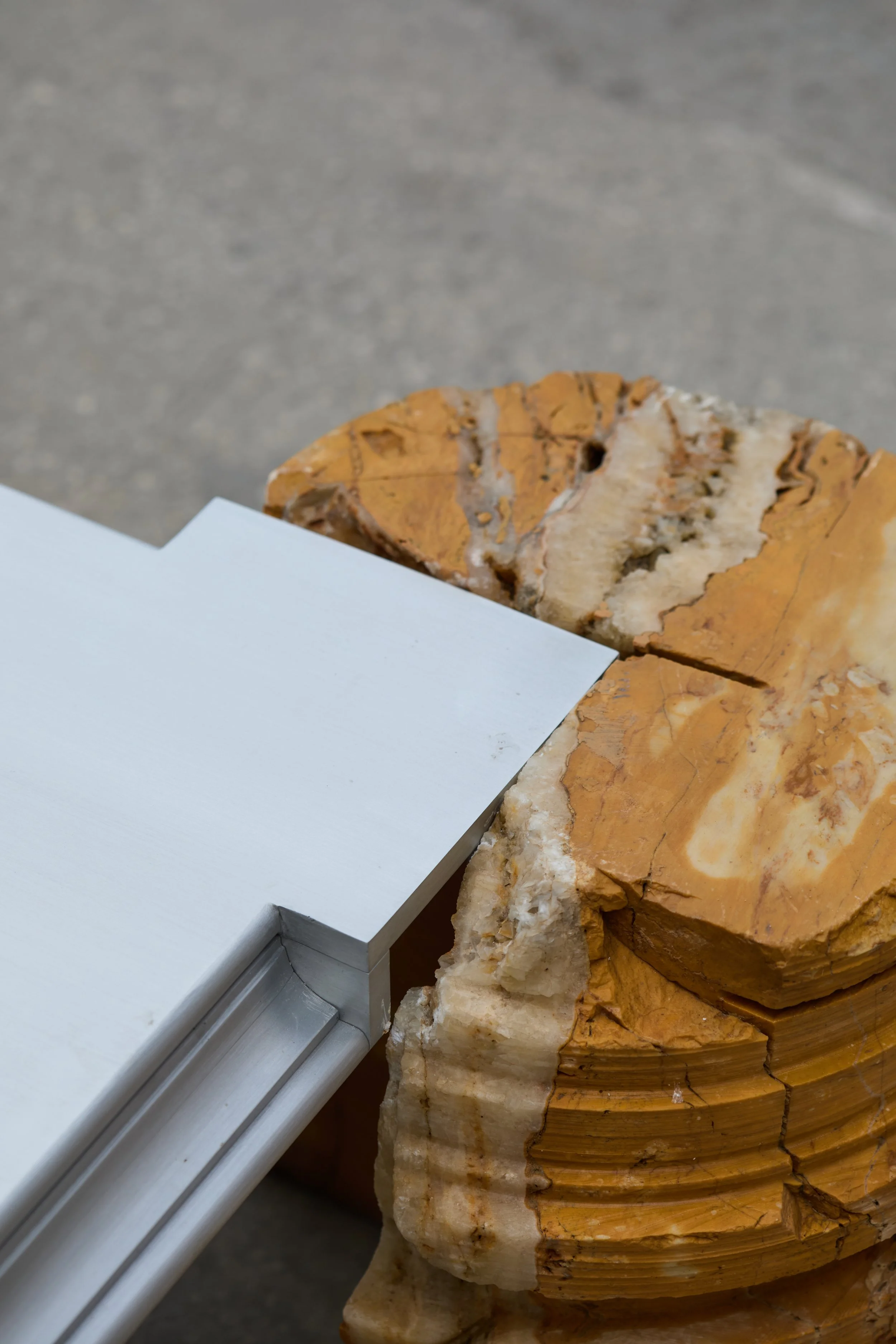 Interrupted stone columns regain purpose beneath precisely crafted aluminum tops.