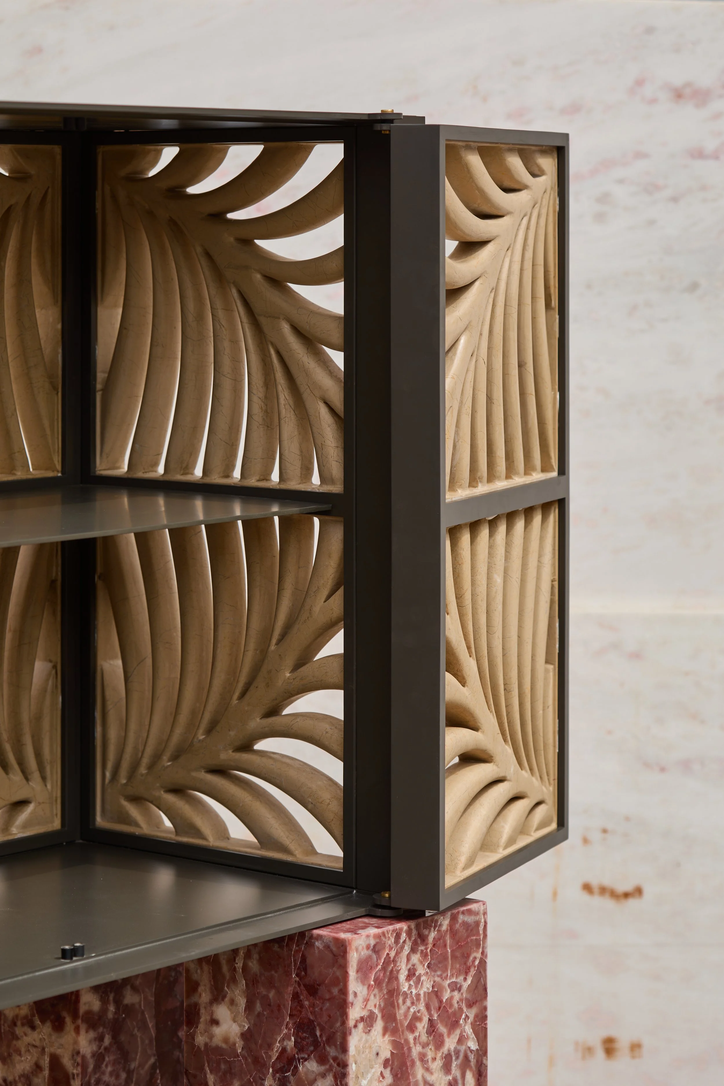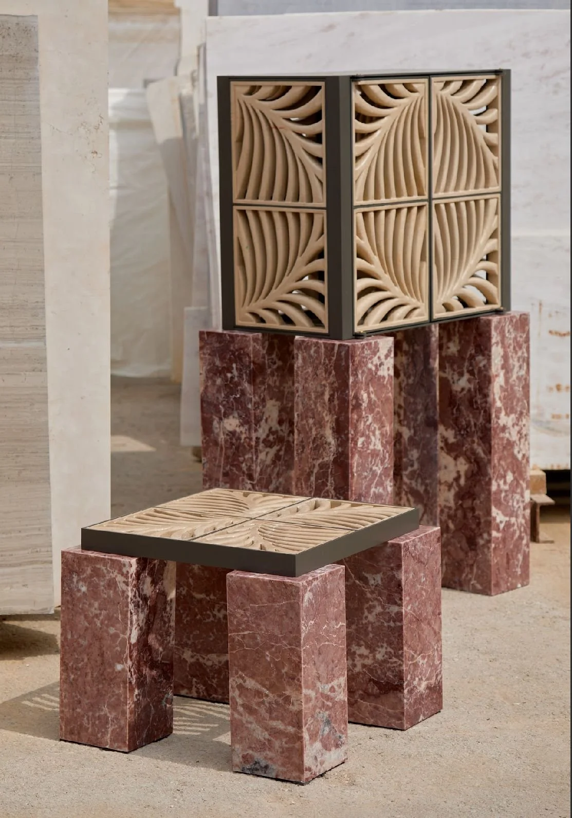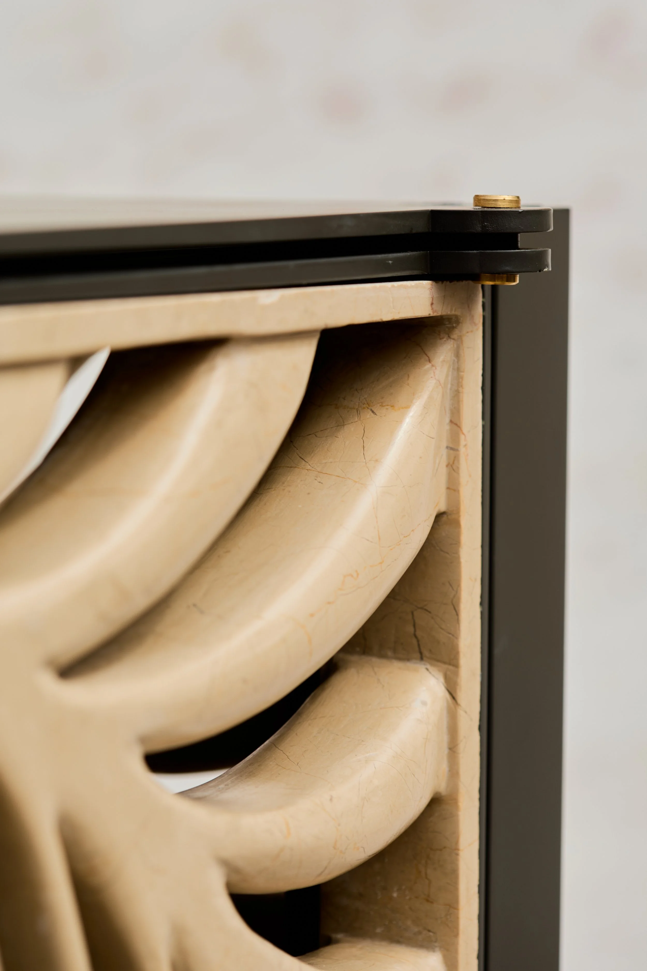 “Light and Shadow” in Japanese, Hikari to Kage reimagines marble separation panels as sculptural cabinet doors.