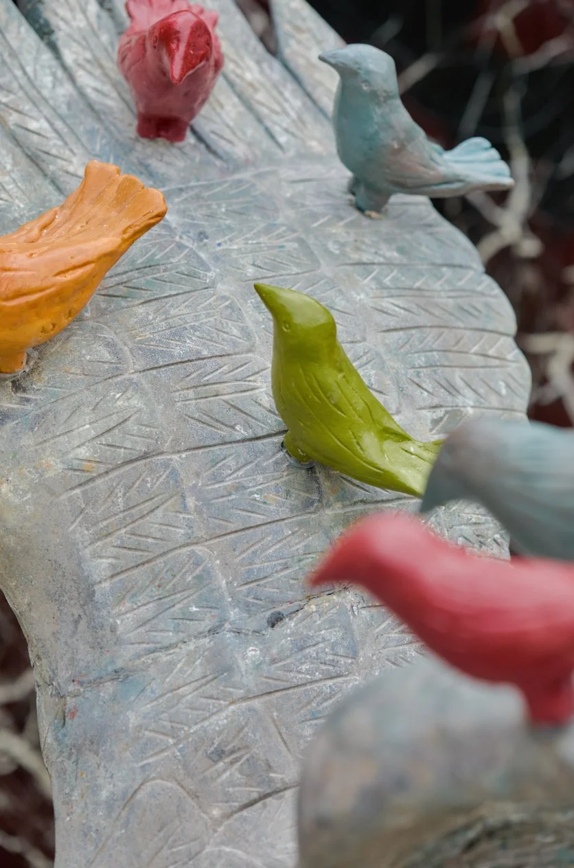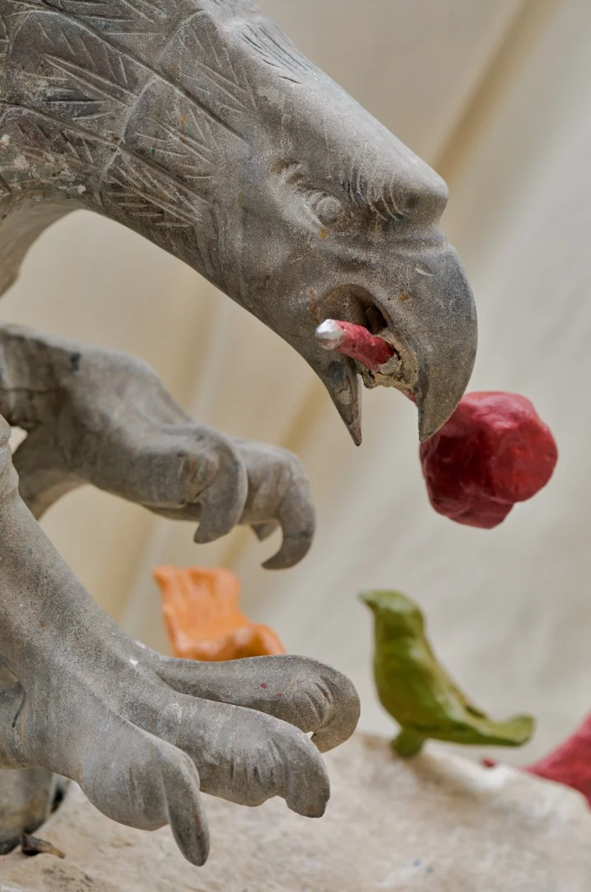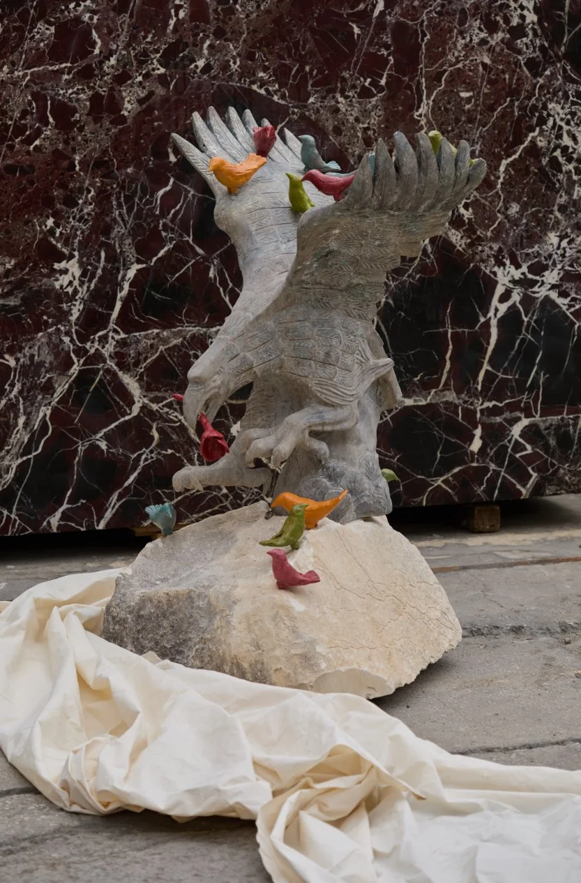 A marble eagle descends from its pedestal into an imagined garden, where power meets tenderness.