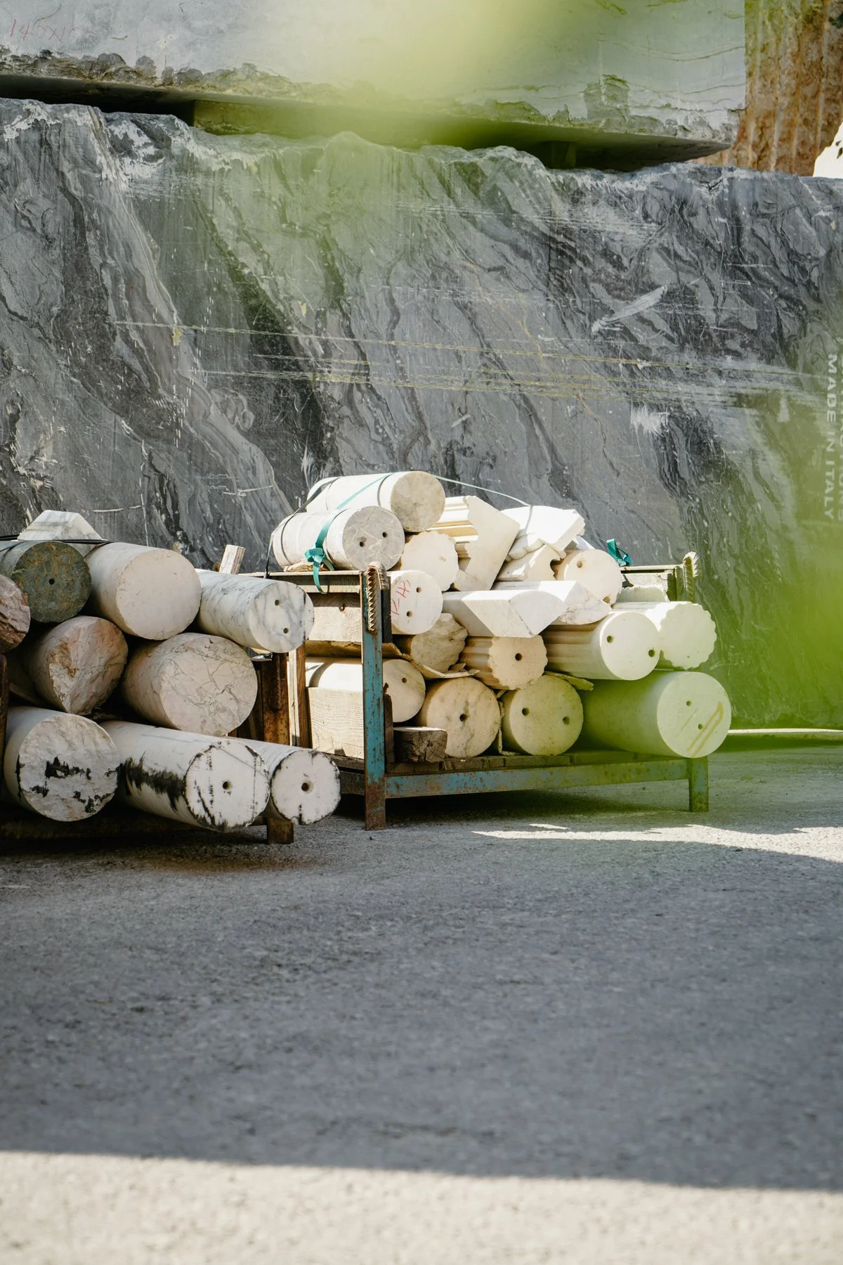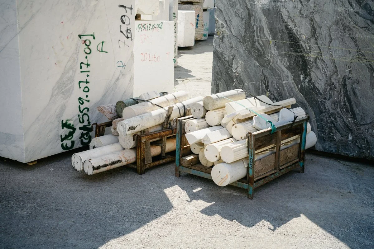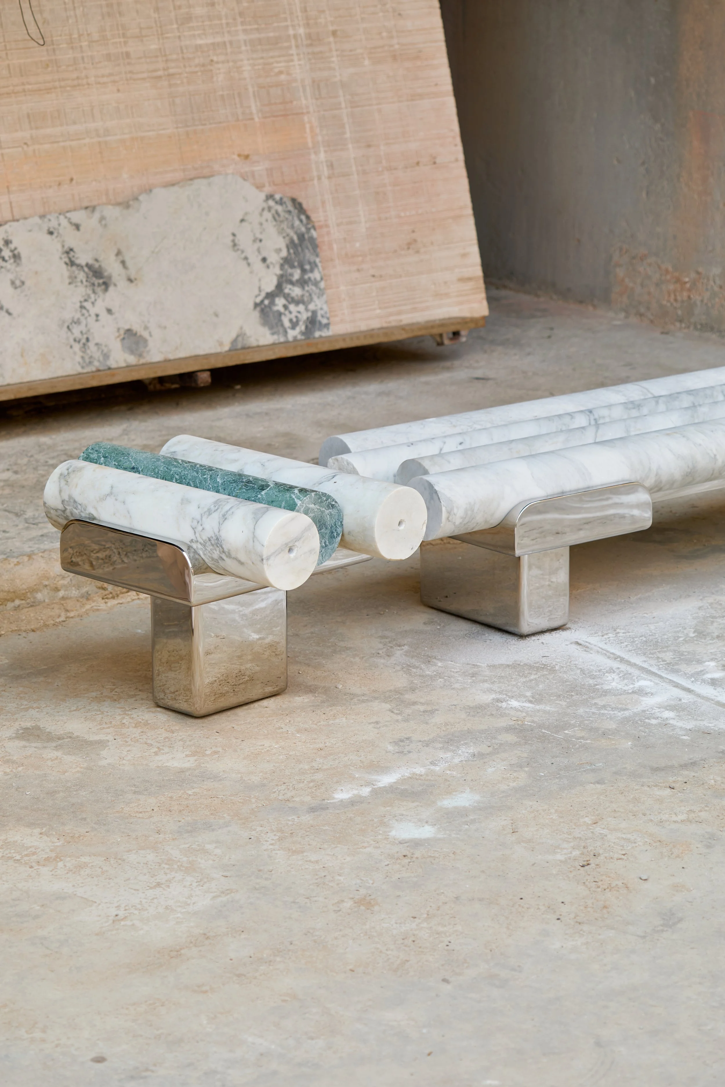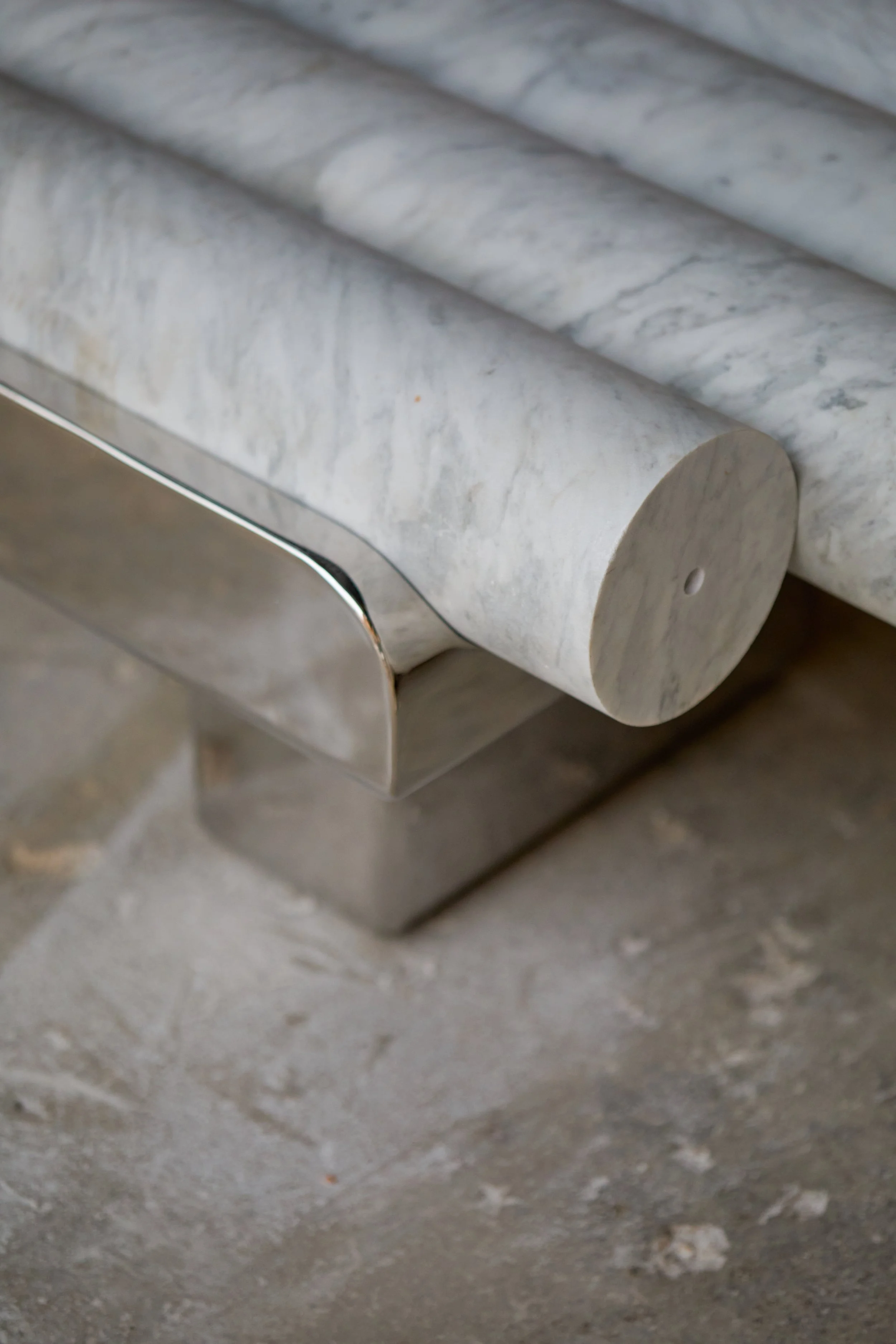 Carrara marble fragments, once broken, are reborn as a table-bench.