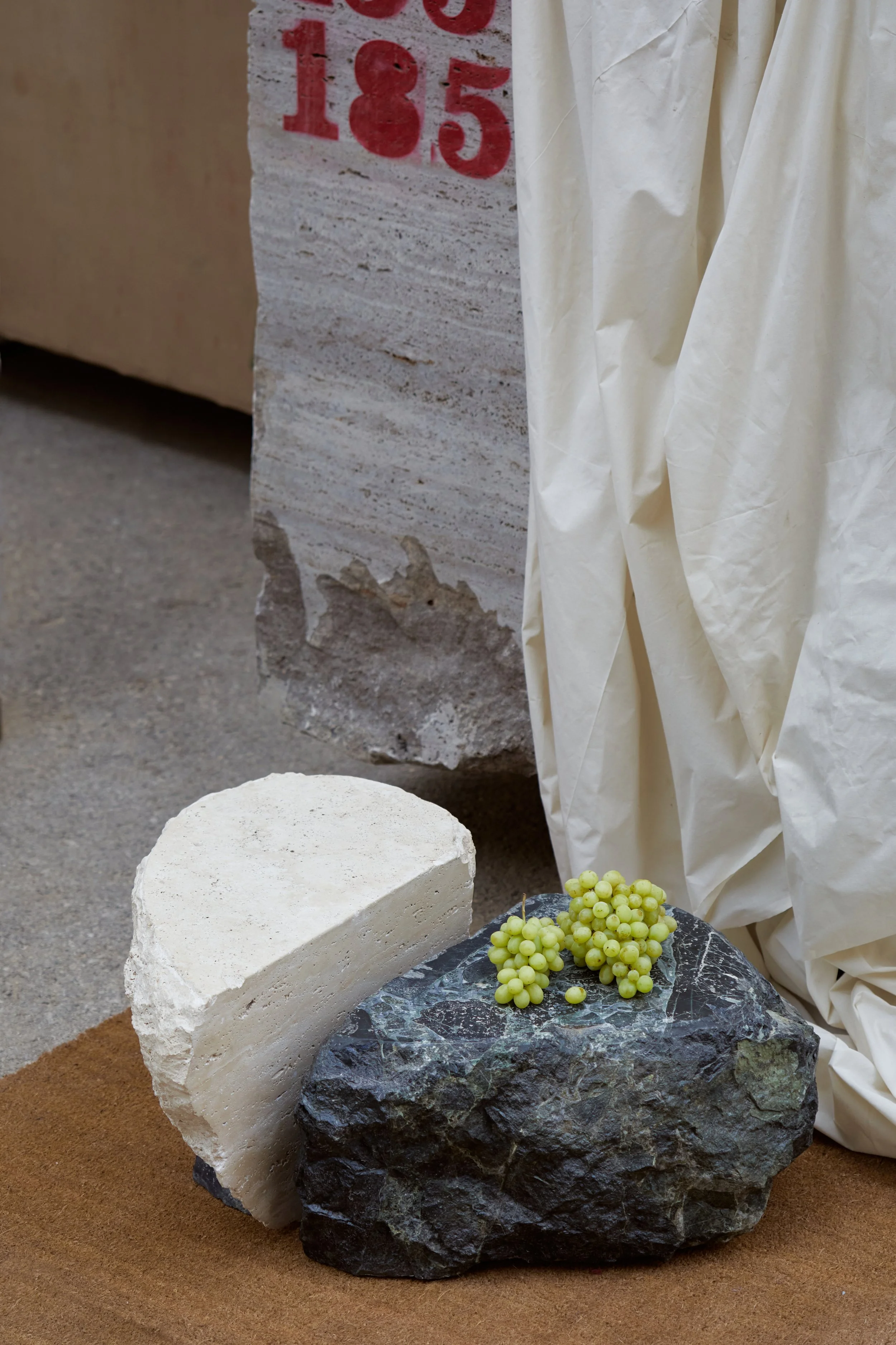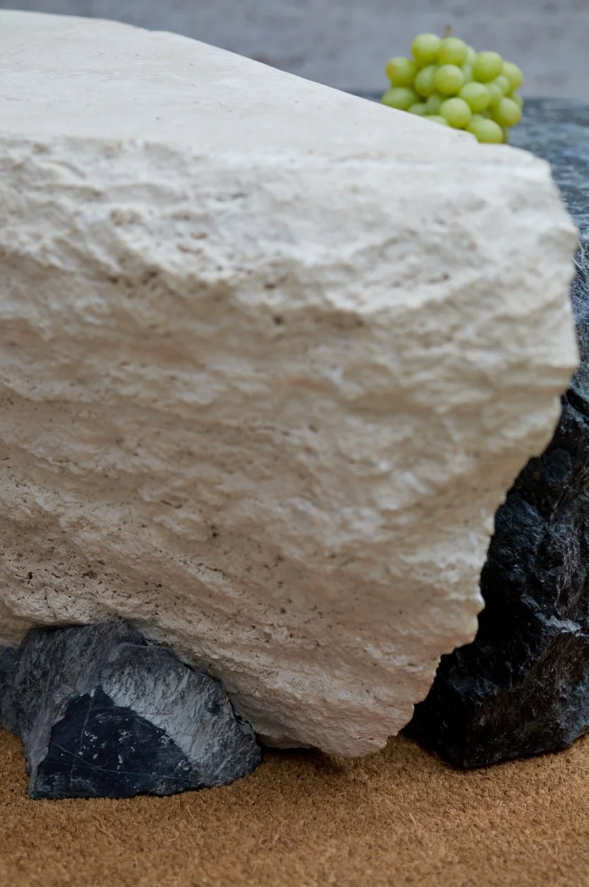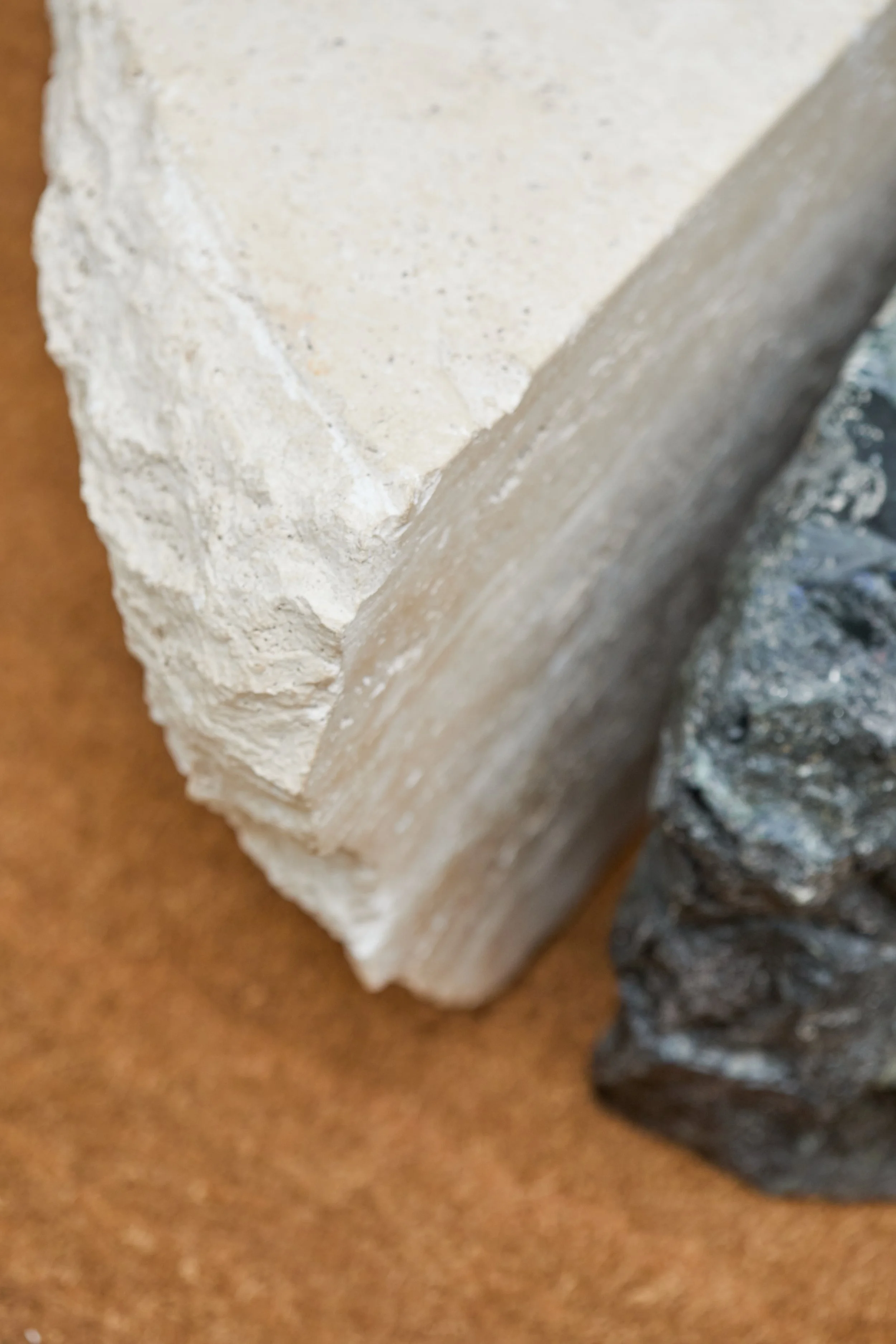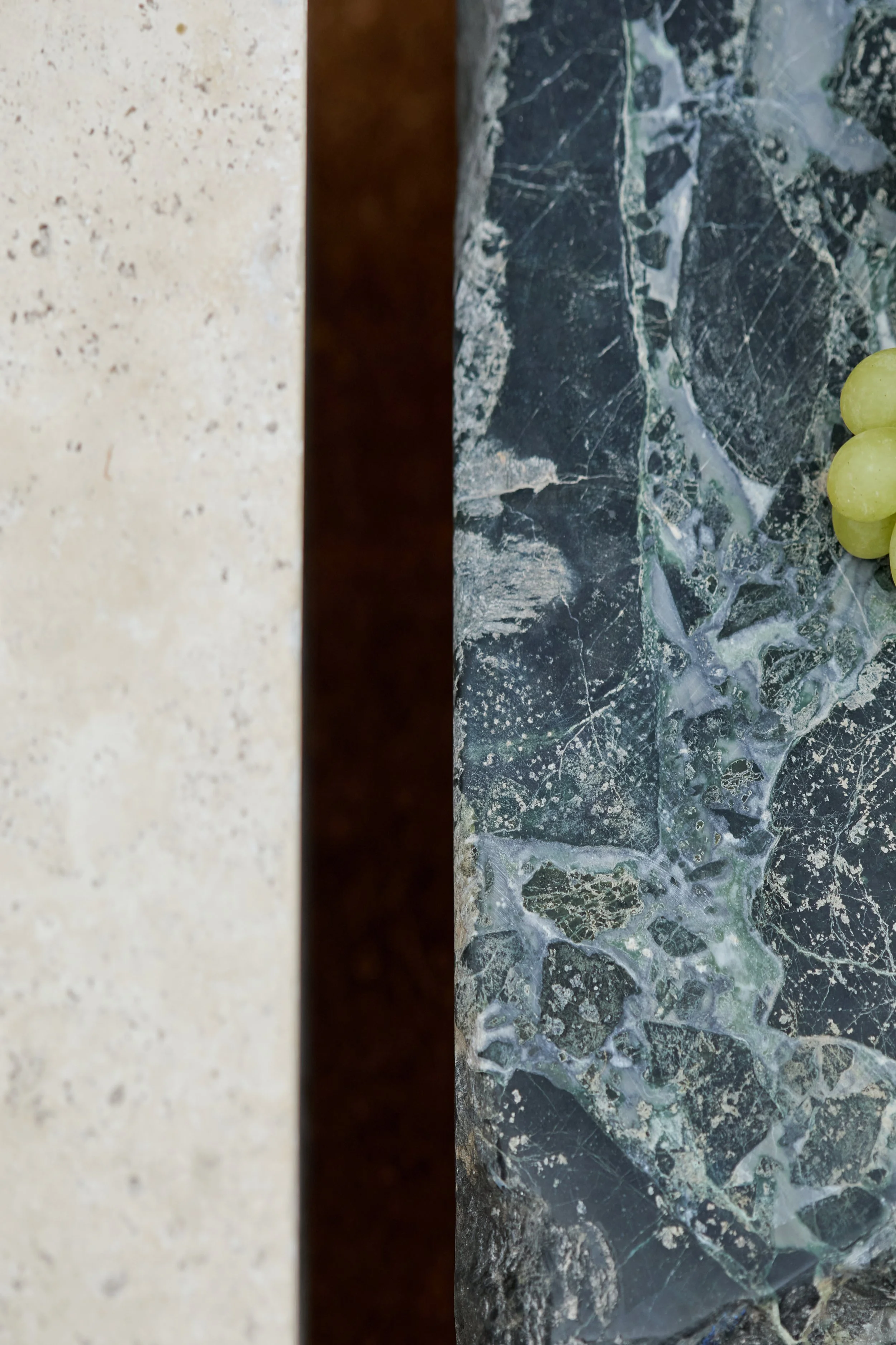 Two fragments of travertine and Verde Tinos marble, shaped by time and human touch, converge in quiet harmony.