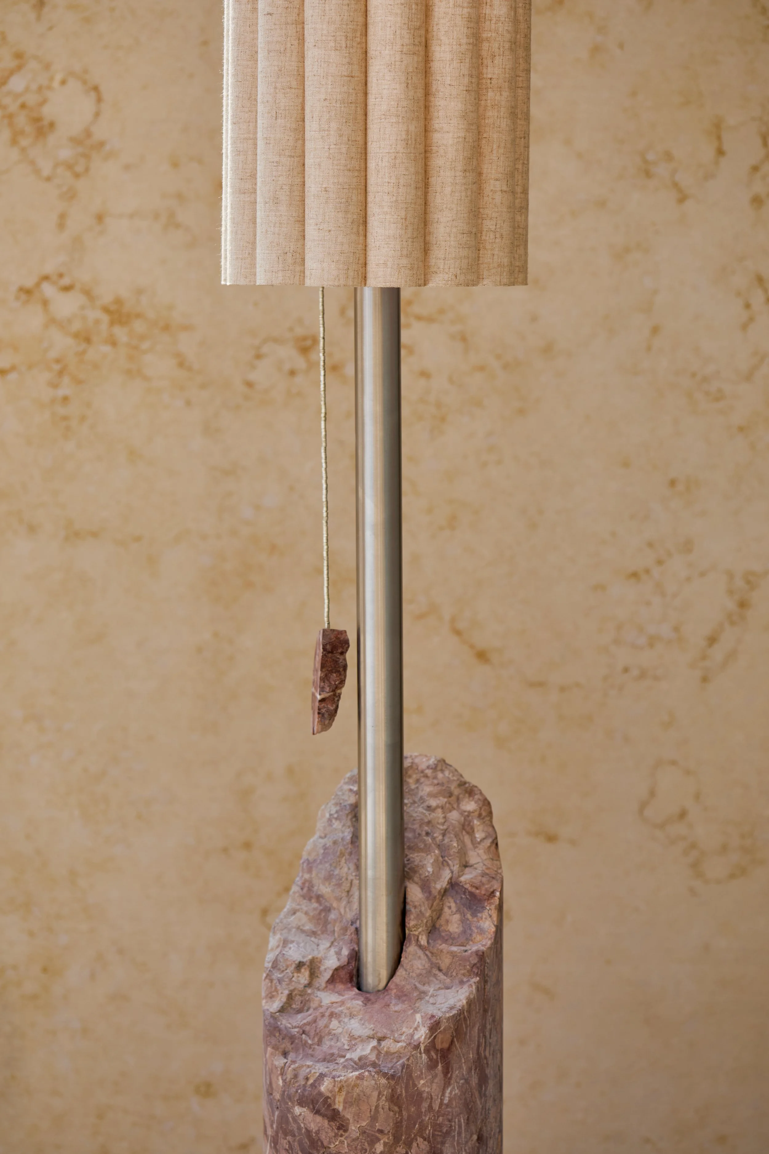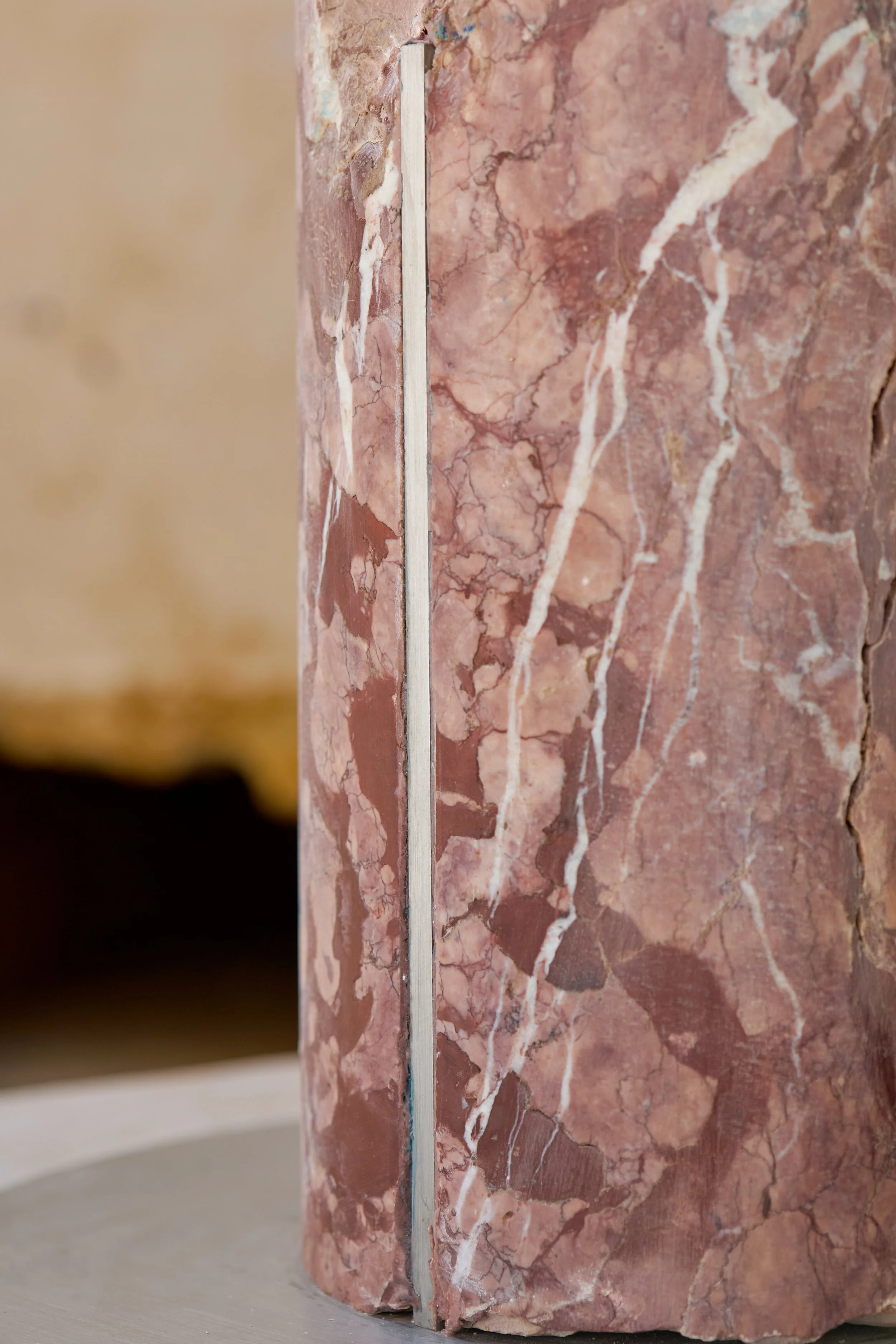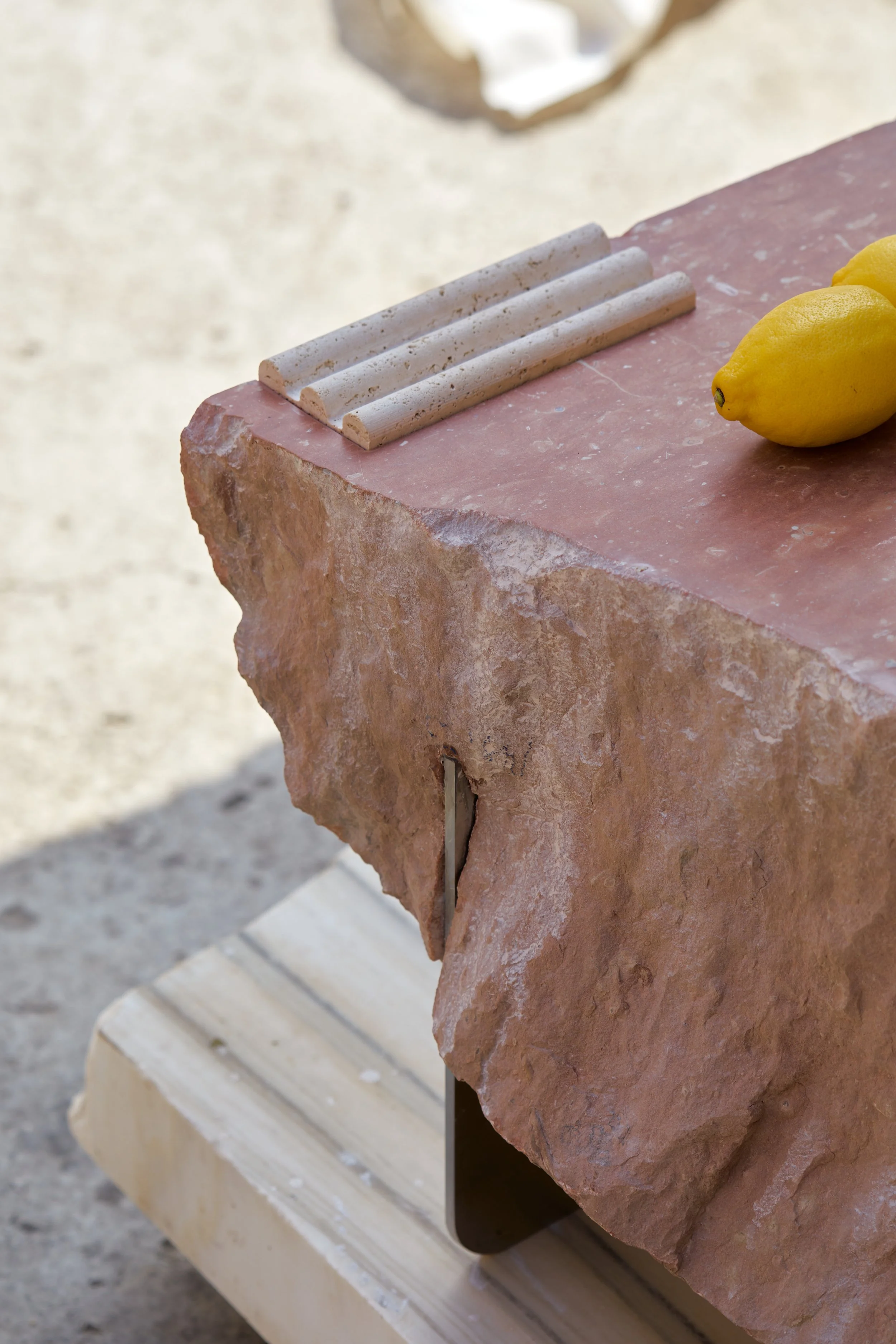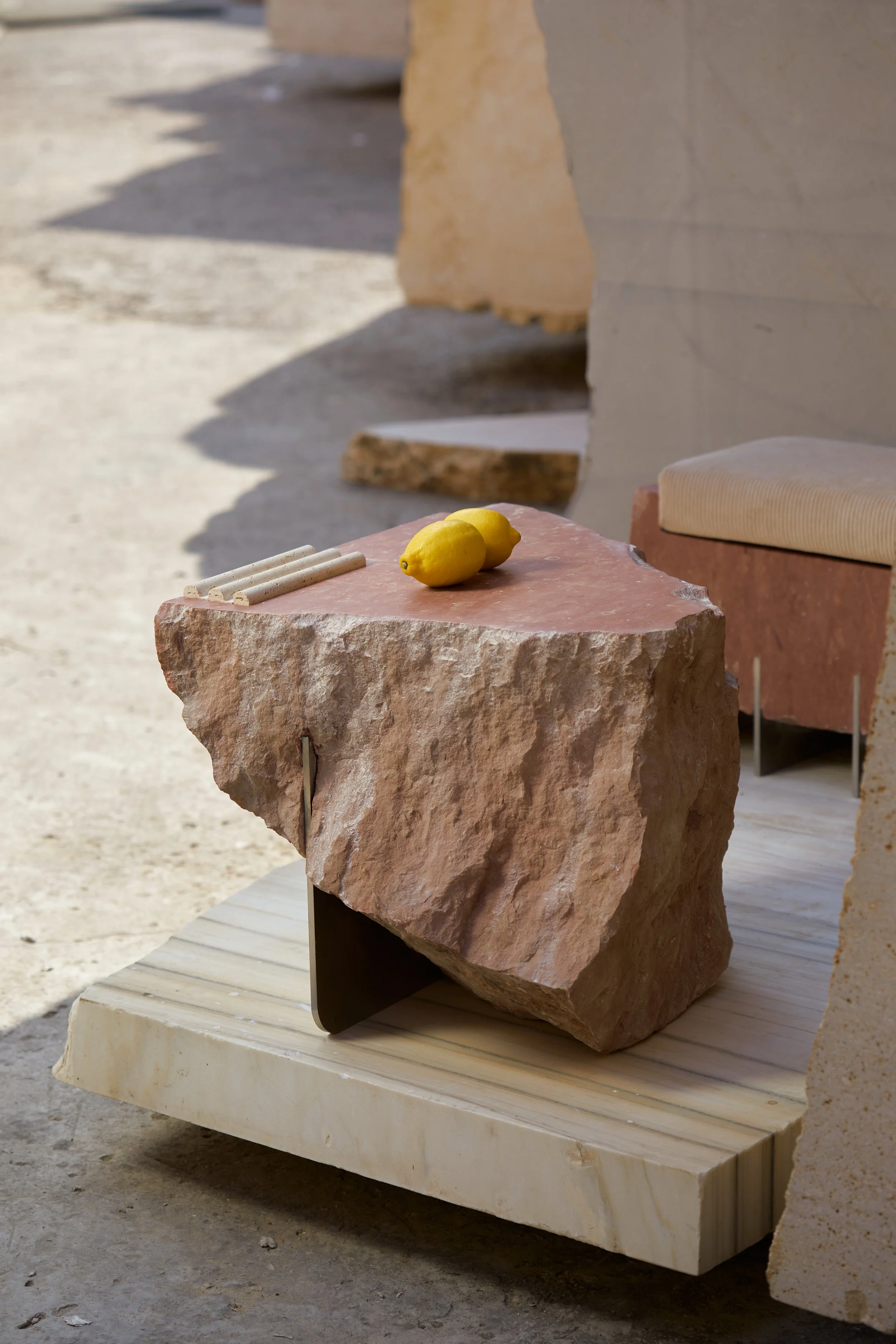 A table, stool, and lamp emerge from fragments of pink-hued marble, chosen for their raw forms and natural presence.
