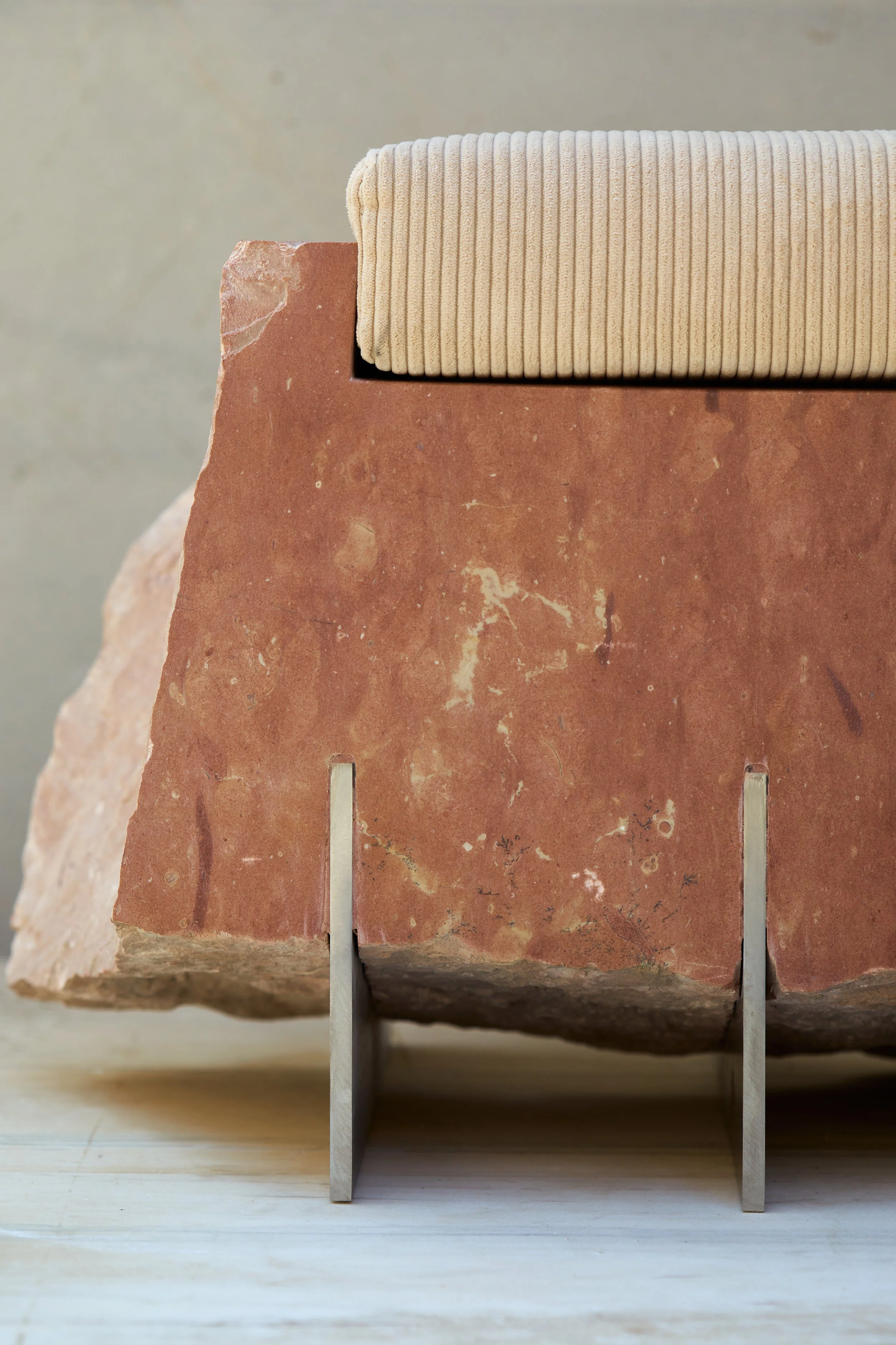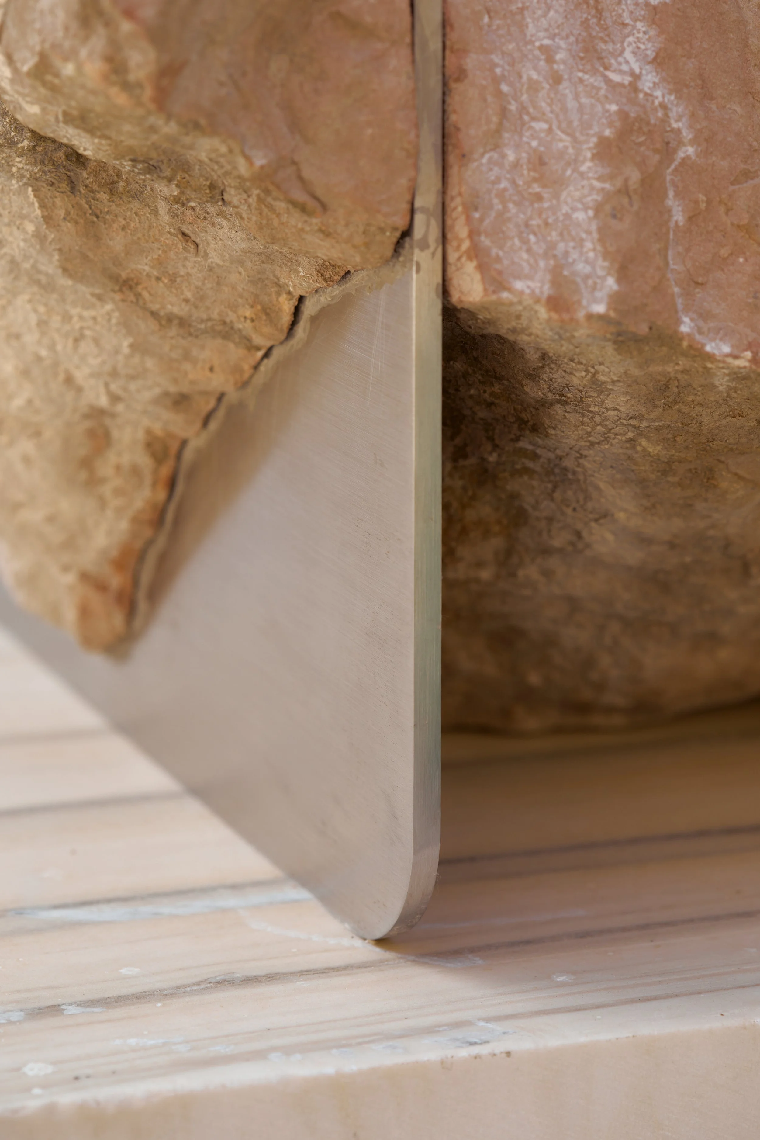 Edges remain uncorrected, volumes preserved, guided only by subtle interventions in steel that steady and celebrate the stone.