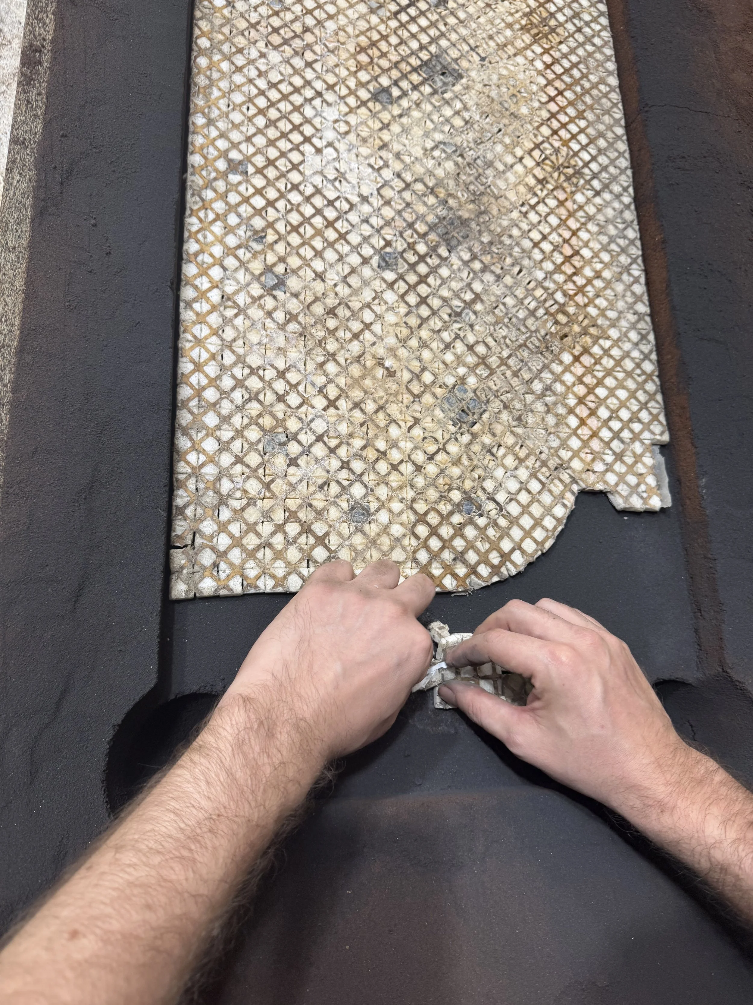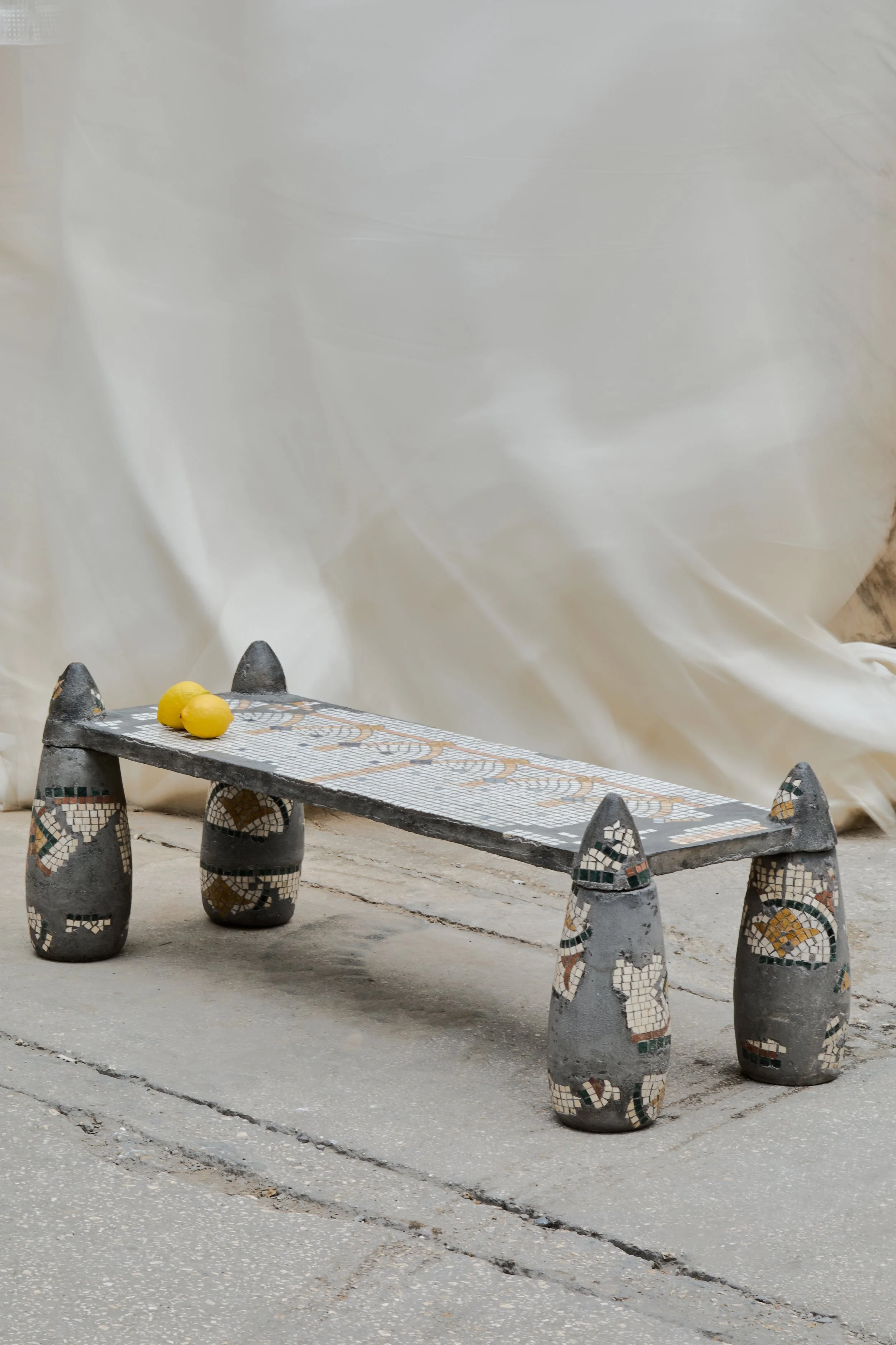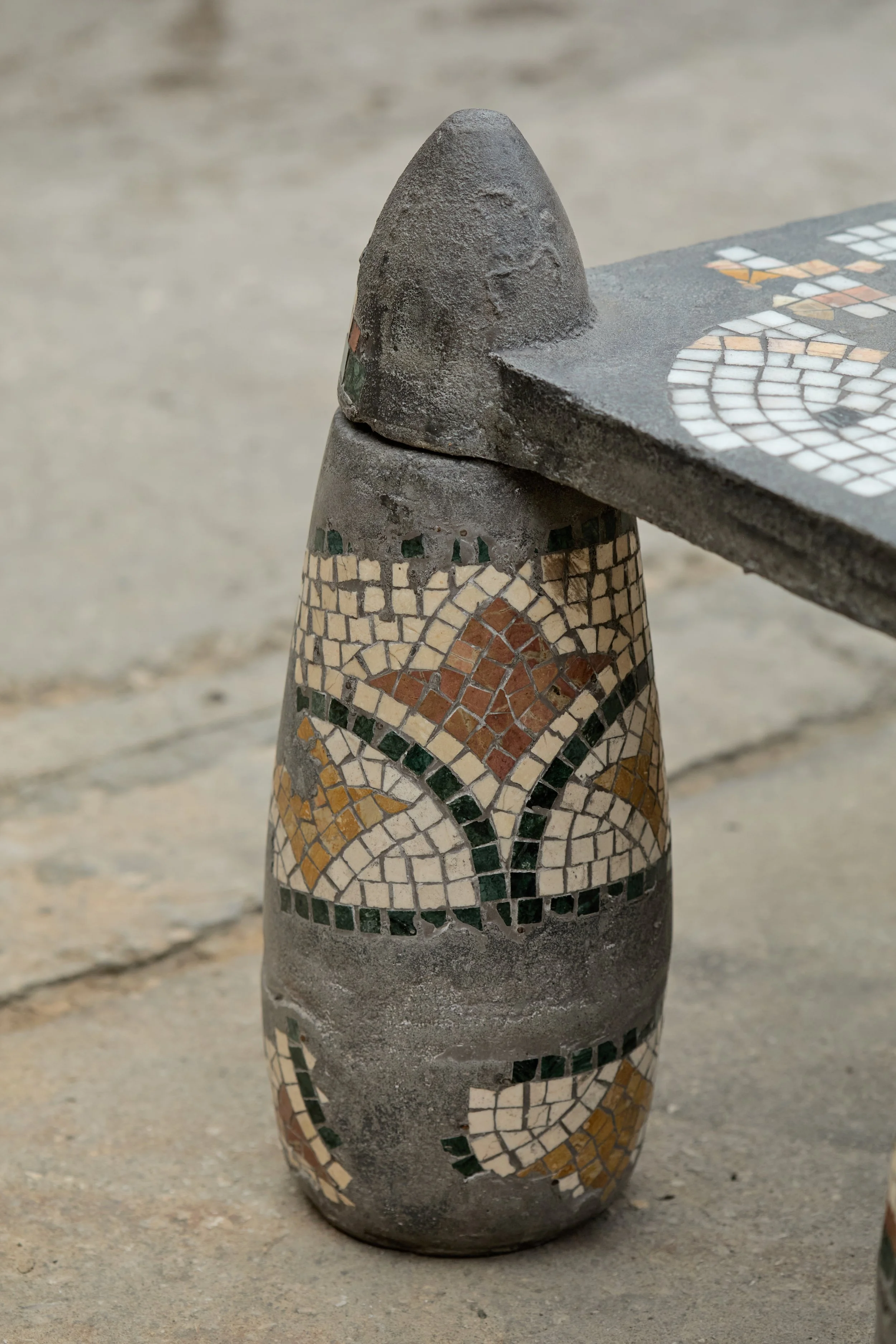 Discarded mosaic fragments are cast into concrete, fused with glass, preserving traces of the past.